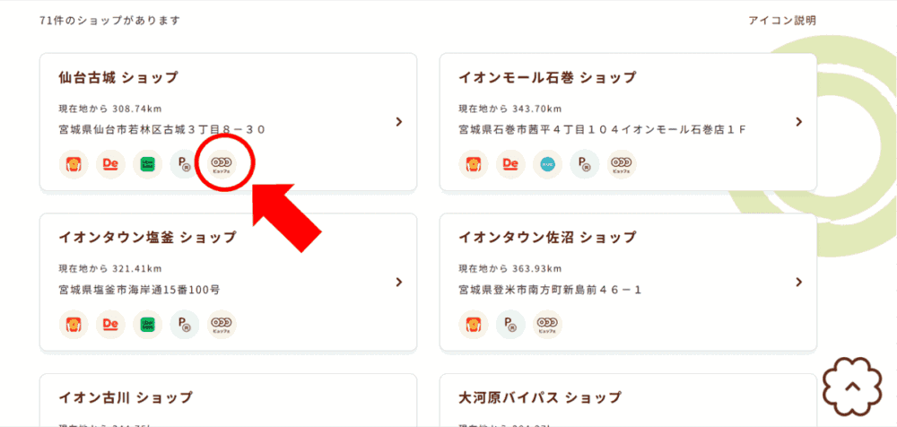 | イオンモール石巻ショップ | 〒986-0866 宮城県石巻市茜平4丁目104イオンモール石巻店1F | 電話番号 0225-93-1340 営業時間 10:00~21:00 |
